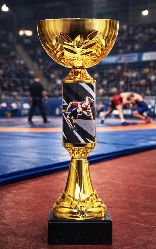 - Sportágspecifikus megjelenés – a birkózás motívuma a trófea középpontjában