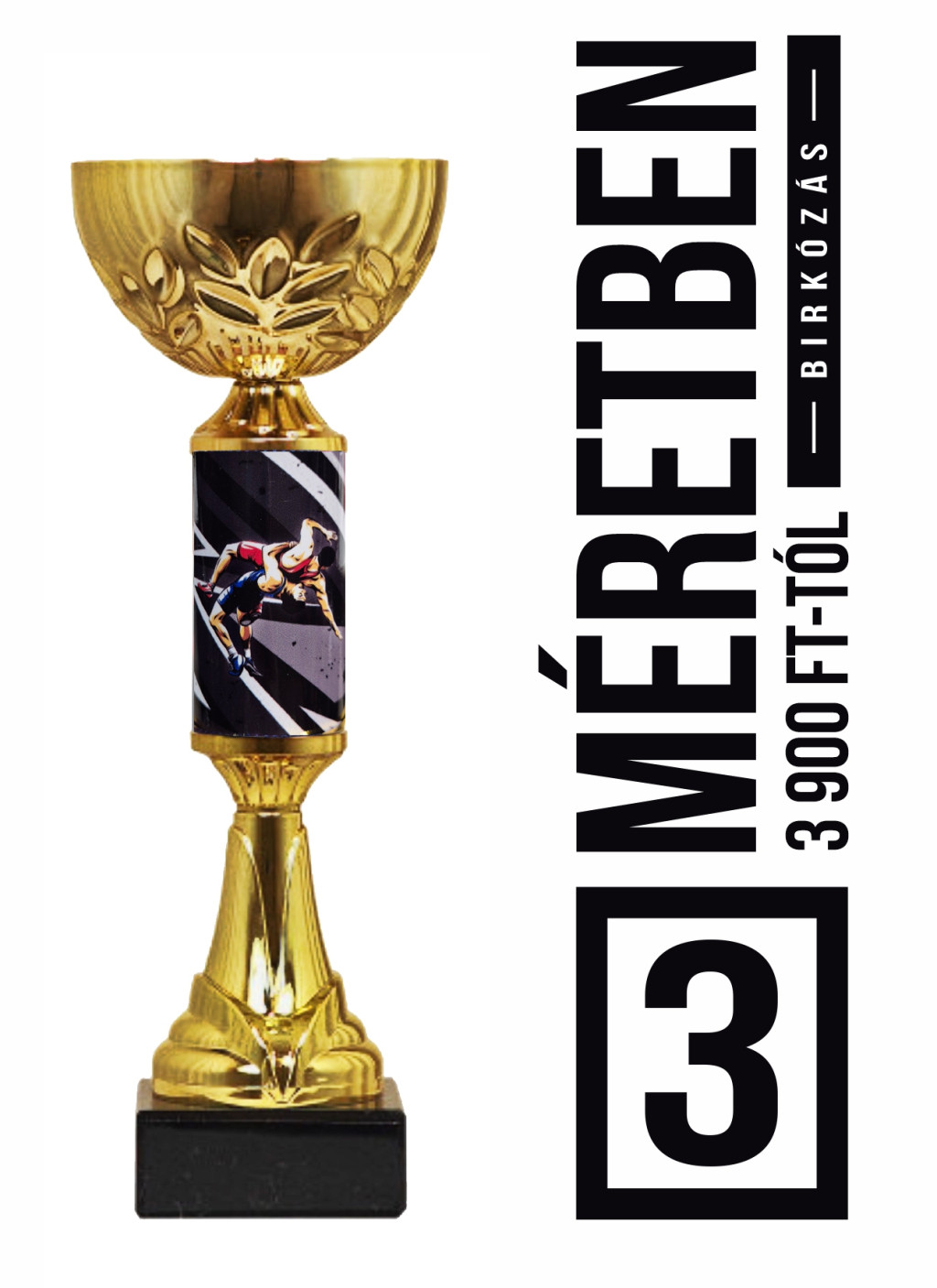 - Sportágspecifikus megjelenés – a birkózás motívuma a trófea középpontjában