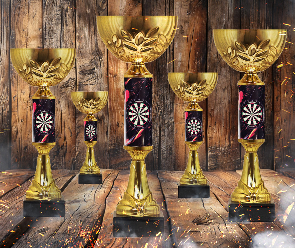 Különleges dartsos serleg hat méretben. Nagyobb mennyiség esetén kérjük telefonon vagy e-mail-ben érdeklődjön nálunk. A kezdőképen a sorozat legnagyobb méretű serlege látható.
