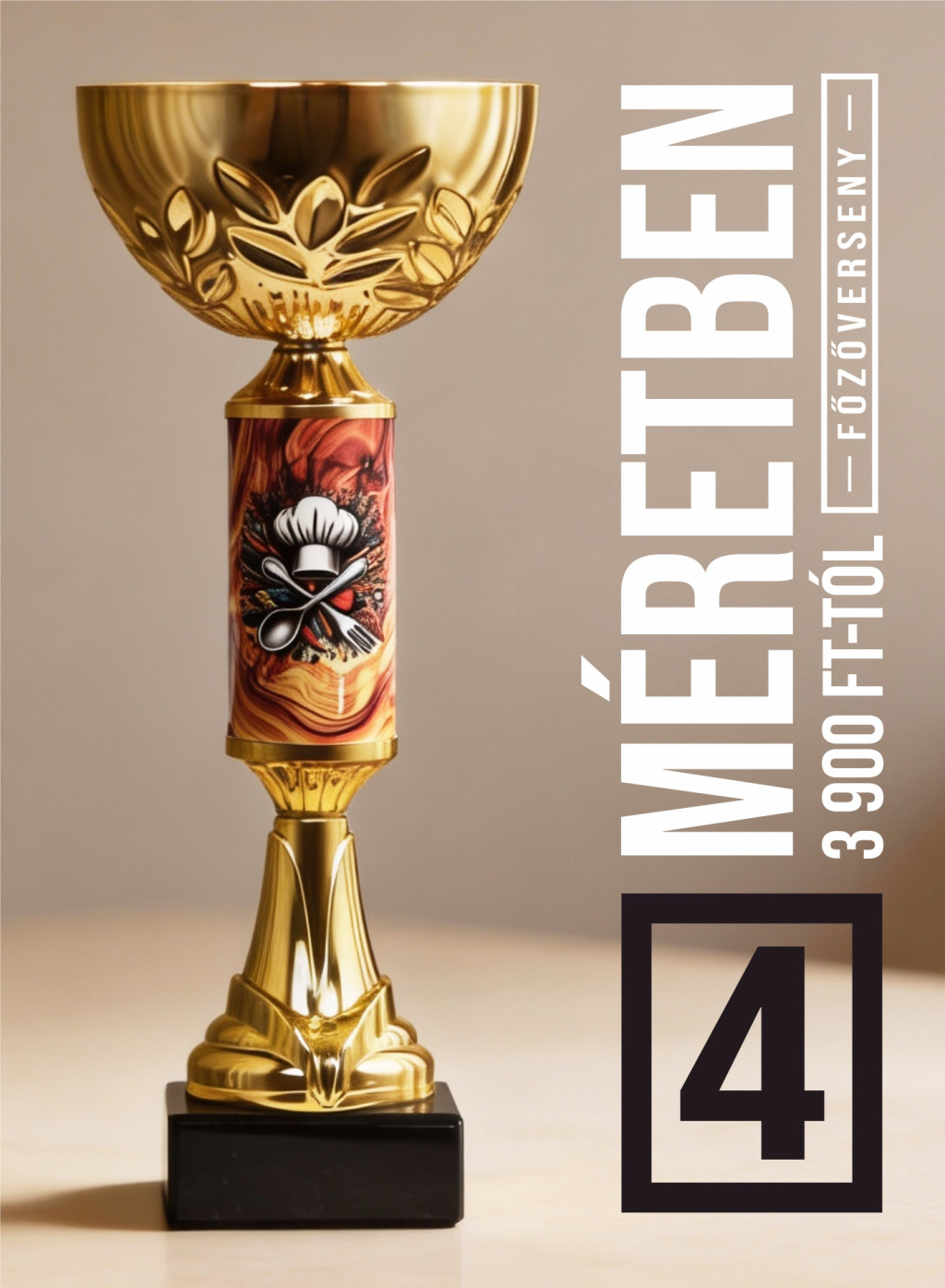 Főzőverseny kupa kategóriánkban ez a serleg ideális választás, ha egy látványos, tiszteletet sugárzó díjat keresel a győztesek és résztvevők számára. 4 méretben elérhető.