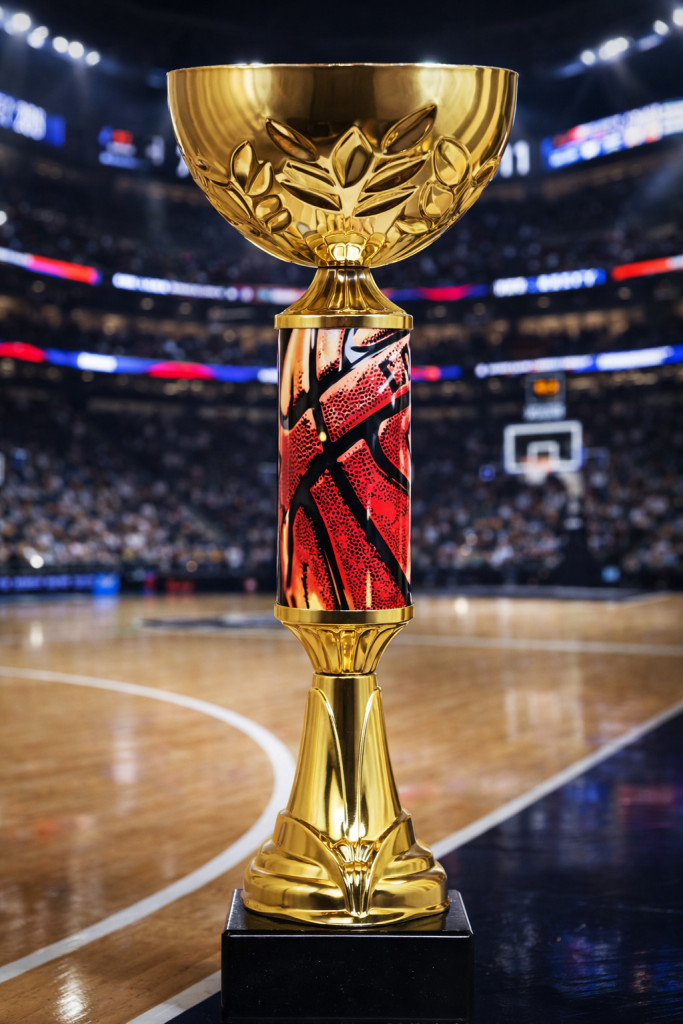 A serleg középső részén elhelyezett színes hengerbetét látványos fókuszpontot ad a trófeának. A grafikán megjelenő kosárlabda motívum dinamikus, sportos megjelenést biztosít, így a díj karakteresen tükrözi a sportág hangulatát és lendületét.