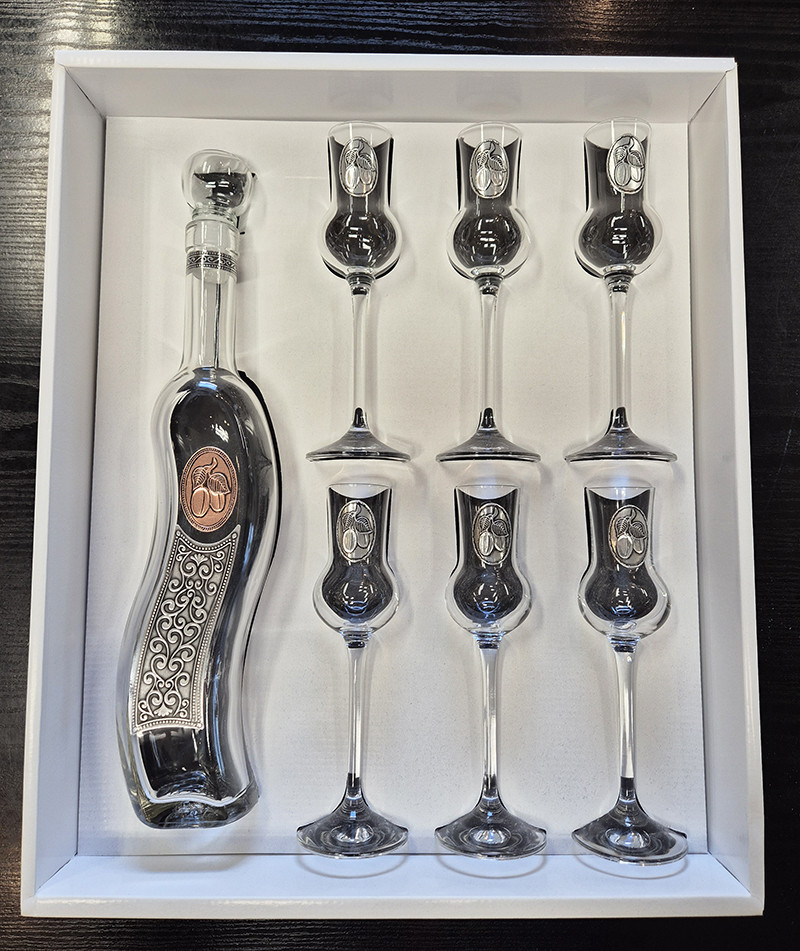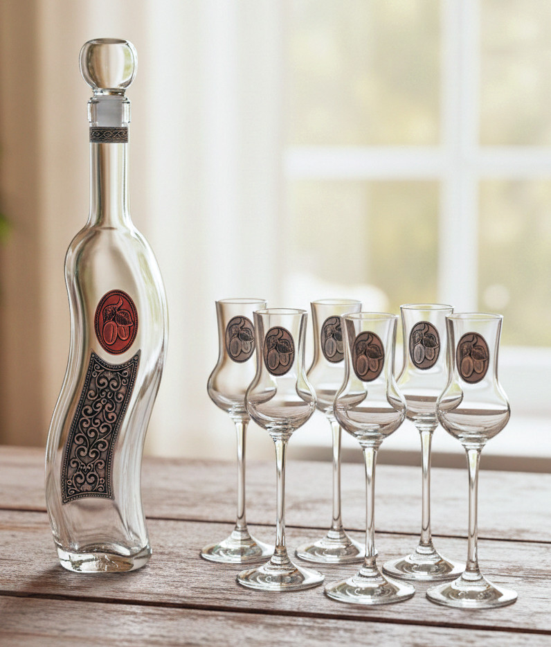 Pálinkás pohár készlet 6 db grappás pohárral (70 ml) és 1 db pálinkás üveggel (500 ml)