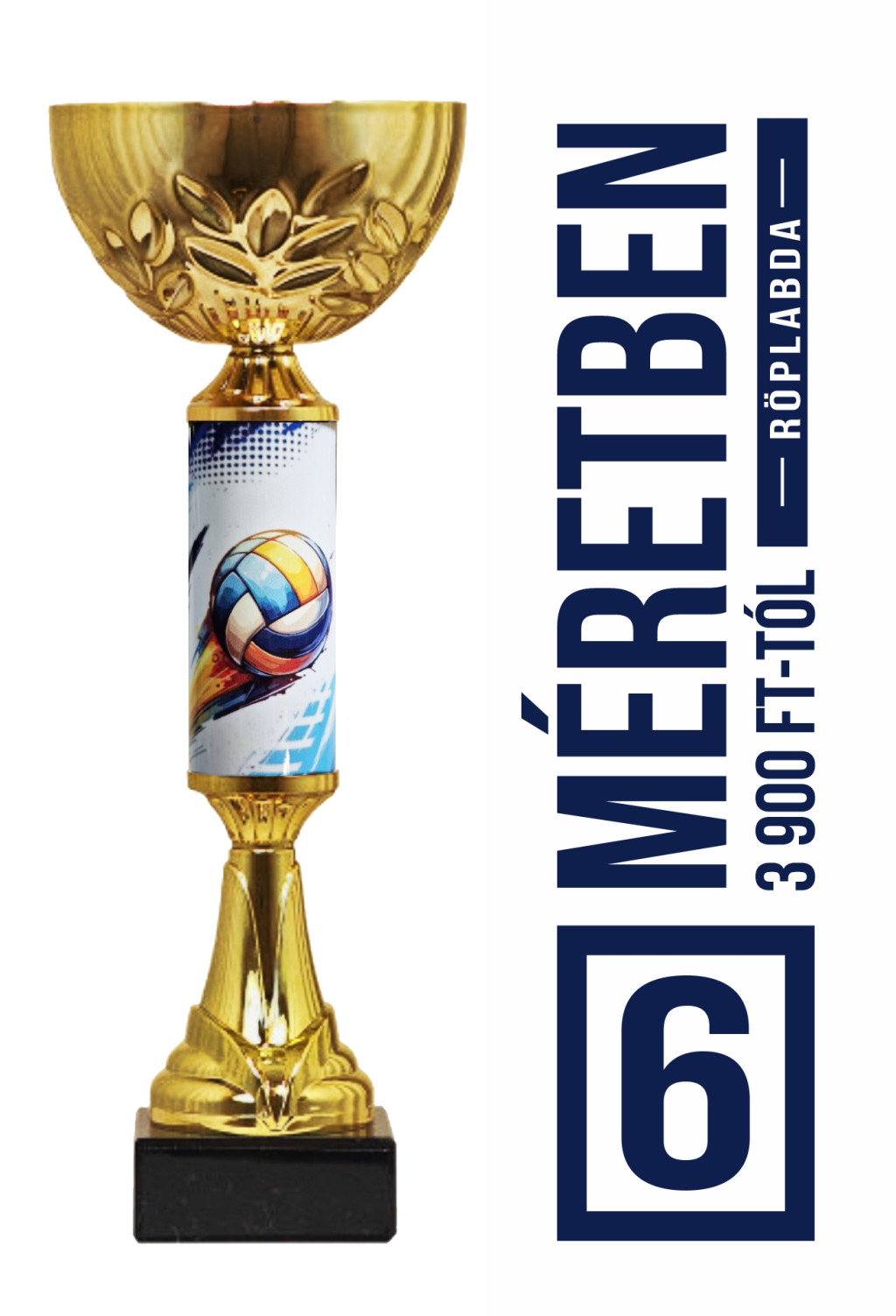 Különleges röplabdás serleg hat méretben. Nagyobb mennyiség esetén kérjük telefonon vagy e-mail-ben érdeklődjön nálunk. A kezdőképen a sorozat legnagyobb méretű serlege látható.