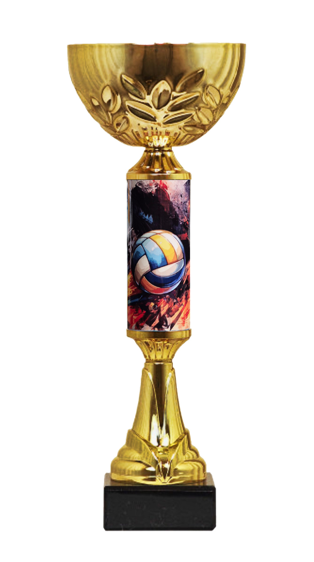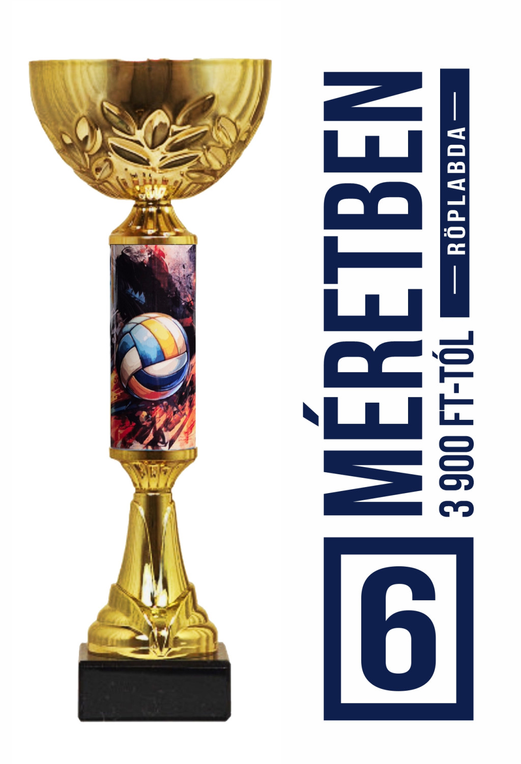 Különleges röplabdás serleg hat méretben. Nagyobb mennyiség esetén kérjük telefonon vagy e-mail-ben érdeklődjön nálunk. A kezdőképen a sorozat legnagyobb méretű serlege látható.