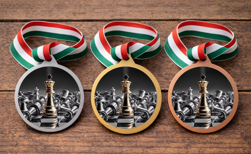 Sakk érem szalaggal – UV nyomtatott, lakkozott grafikával (arany / ezüst / bronz)