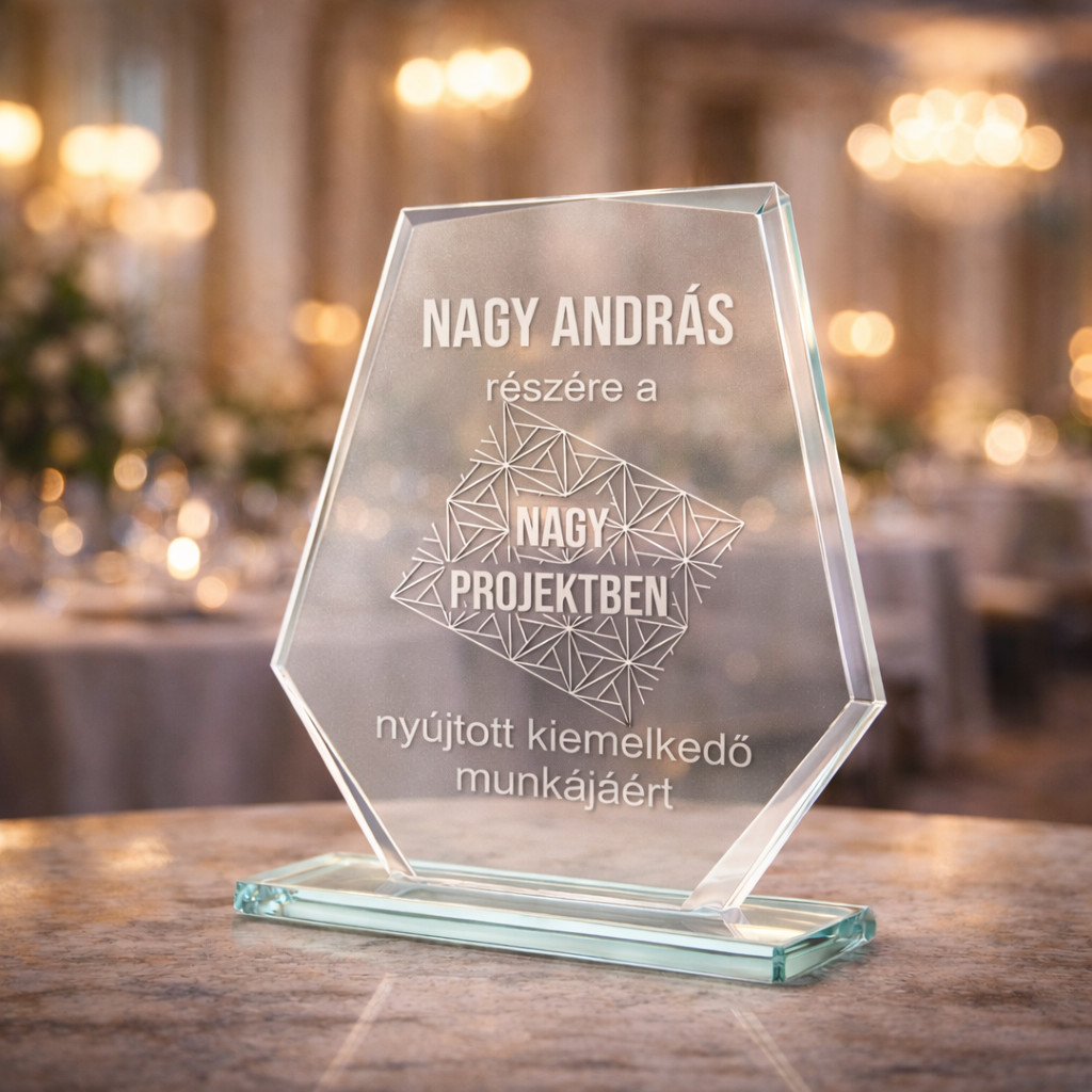 Ez az elegáns üveg díj méltó választás születésnap, évforduló, sportdíjazás, nyugdíjazás, jubileum vagy céges elismerés alkalmából. Letisztult, modern formavilága és minőségi kivitelezése időtálló emléket biztosít bármilyen különleges alkalomra. A nagy, sík felület ideális gravírozott feliratok, nevek, évszámok és egyedi üzenetek elhelyezésére, legyen szó személyes ajándékról vagy hivatalos díjról.