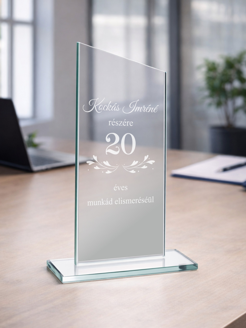 Ez az elegáns üveg díj méltó választás születésnap, évforduló, sportdíjazás, nyugdíjazás, jubileum vagy céges elismerés alkalmából. Letisztult, modern formavilága és minőségi kivitelezése időtálló emléket biztosít bármilyen különleges alkalomra. A nagy, sík felület ideális gravírozott feliratok, nevek, évszámok és egyedi üzenetek elhelyezésére, legyen szó személyes ajándékról vagy hivatalos díjról.