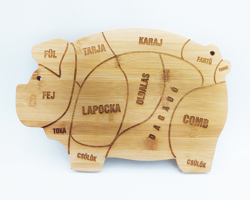 Vidám megjelenésű, mégis jól használható bambusz vágódeszka malac formában, amely előre gravírozott mintával készült, így azonnal ajándékozható. Ideális konyhai kiegészítő mindennapi használatra, de tálaláshoz vagy dekorációként is remek választás.